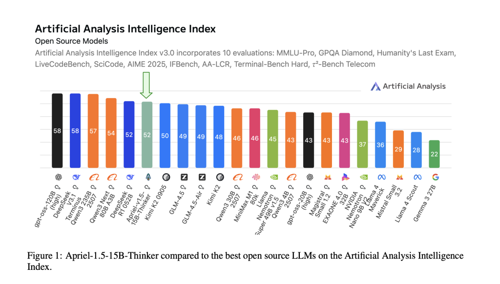 • Frontier-level composite score at small scale. The model reports Artificial Analysis Intelligence Index (AAI) = 52, matching DeepSeek-R1-0528 on that combined metric while being dramatically smaller. AAI aggregates 10 third-party evaluations (MMLU-Pro, GPQA Diamond, Humanity’s Last Exam, LiveCodeBench, SciCode, AIME 2025, IFBench, AA-LCR, Terminal-Bench Hard, τ²-Bench Telecom).