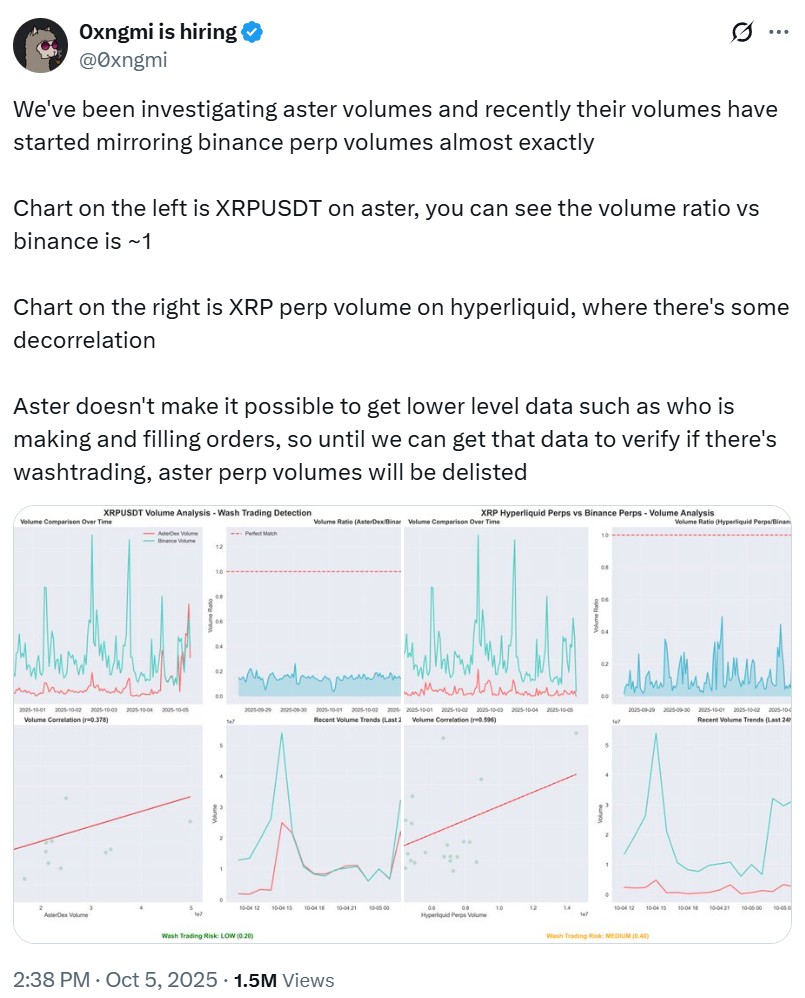 But on Sunday, DefiLlama founder 0xngmi said on X that Aster’s reported volumes mirrored those of Binance’s perpetuals market, prompting the platform’s removal.