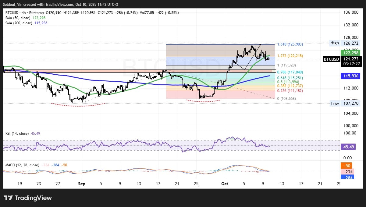 Looking at the BTCUSD 4-hour price chart, Bitcoin is holding above the key support at $119,320, just below the current price of $121,273. This support zone sits near recent lows and is watched closely by traders.