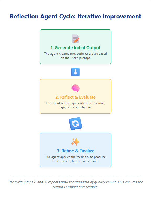 A Reflection Agent is an AI that can step back and evaluate its own work, identify mistakes, and improve through trial and error—similar to how humans learn from feedback.