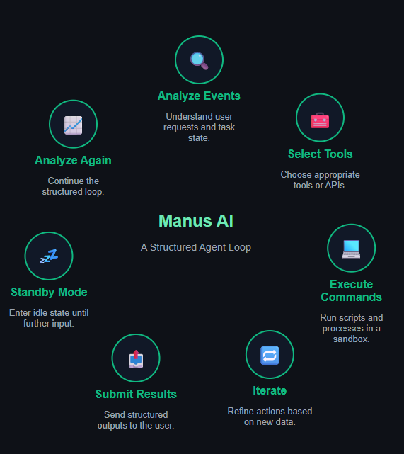 A good example is Manus AI, which uses a structured agent loop to process tasks step by step. It first analyzes the user’s request, selects the right tools or APIs, executes commands in a secure Linux sandbox, and iterates based on feedback until the job is done. Finally, it submits results to the user and enters standby mode, waiting for the next instruction.