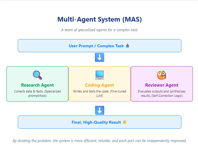 The above image visualizes a Multi-Agent System (MAS), illustrating how a single user prompt is decomposed into specialized tasks handled in parallel by three distinct agents (Research, Coding, and Reviewer) before being synthesized into a final, high-quality output.