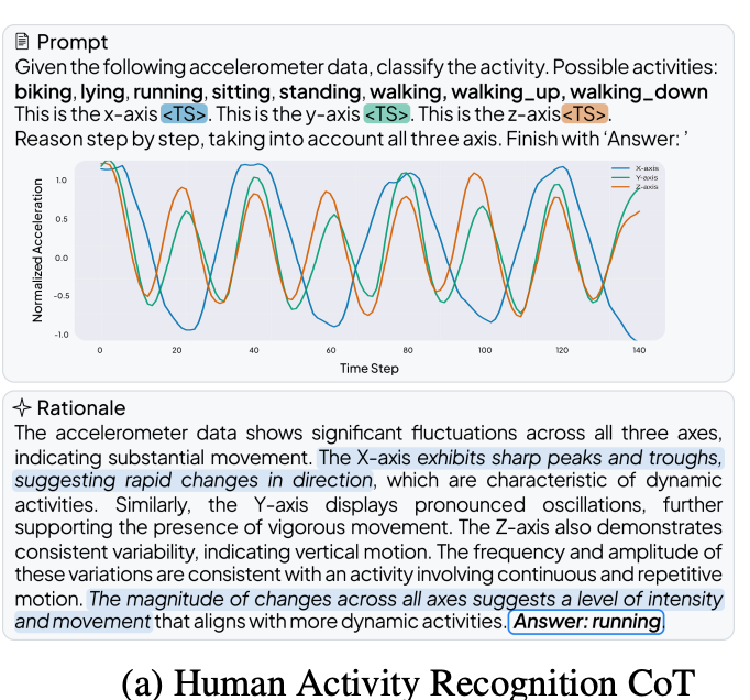 The results demonstrate the clear superiority of the specialized TSLM approach. To benchmark performance, the team created three new Chain-of-Thought (CoT) datasets focused on medical reasoning: HAR-CoT (activity recognition), Sleep-CoT (EEG sleep staging), and ECG-QA-CoT (ECG question answering).