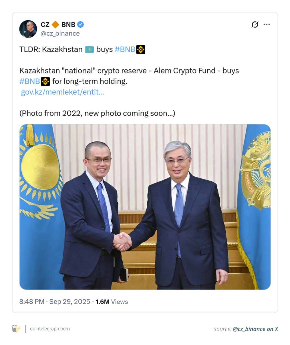 Surprisingly, the fund’s inaugural purchase was not Bitcoin (BTC) but BNB (BNB), the native token of the BNB Chain. Through a strategic partnership with Binance Kazakhstan, a local entity licensed under the Astana International Financial Centre (AIFC) regime, the fund was able to secure custody and align with compliance frameworks from the outset.