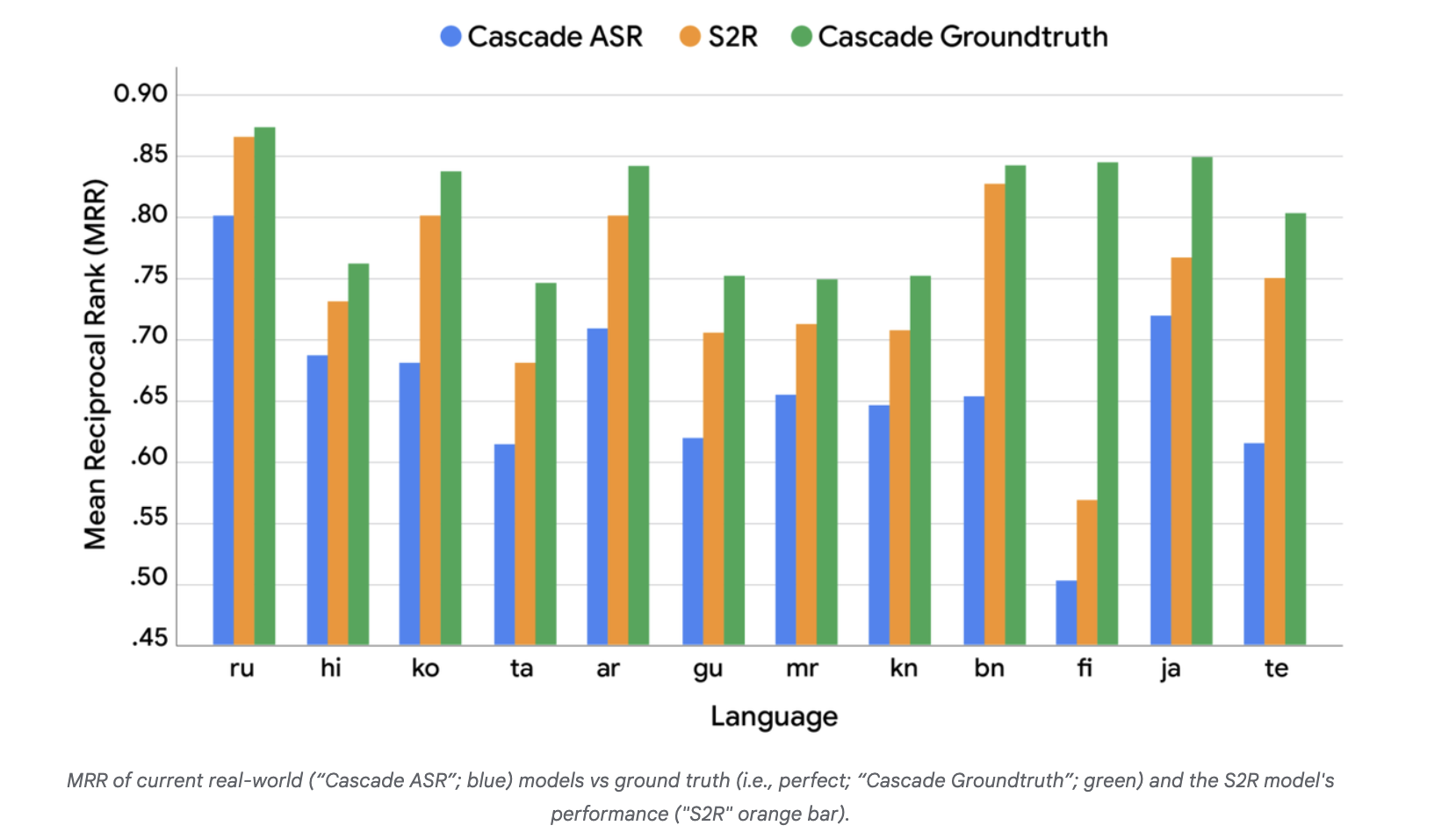 Google’s research team analyzed the disconnect between word error rate (WER) (ASR quality) and mean reciprocal rank (MRR) (retrieval quality). Using human-verified transcripts to simulate a cascade groundtruth “perfect ASR” condition, the team compared (i) Cascade ASR (real-world baseline) vs (ii) Cascade groundtruth (upper bound) and observed that lower WER does not reliably predict higher MRR across languages. The persistent MRR gap between the baseline and groundtruth indicates room for models that optimize retrieval intent directly from audio.