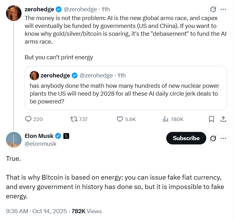 Musk’s comment came in response to popular analyst Zerohedge’s post, which attributed the current momentum behind Bitcoin and precious metals to a “debasement” to fund the government-funded AI arms race that will play out between the world’s largest economies.