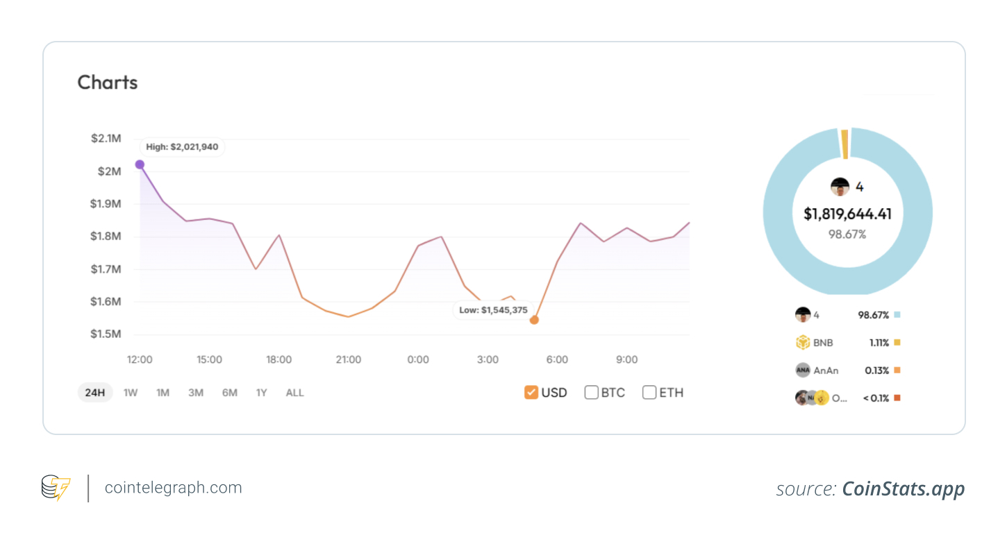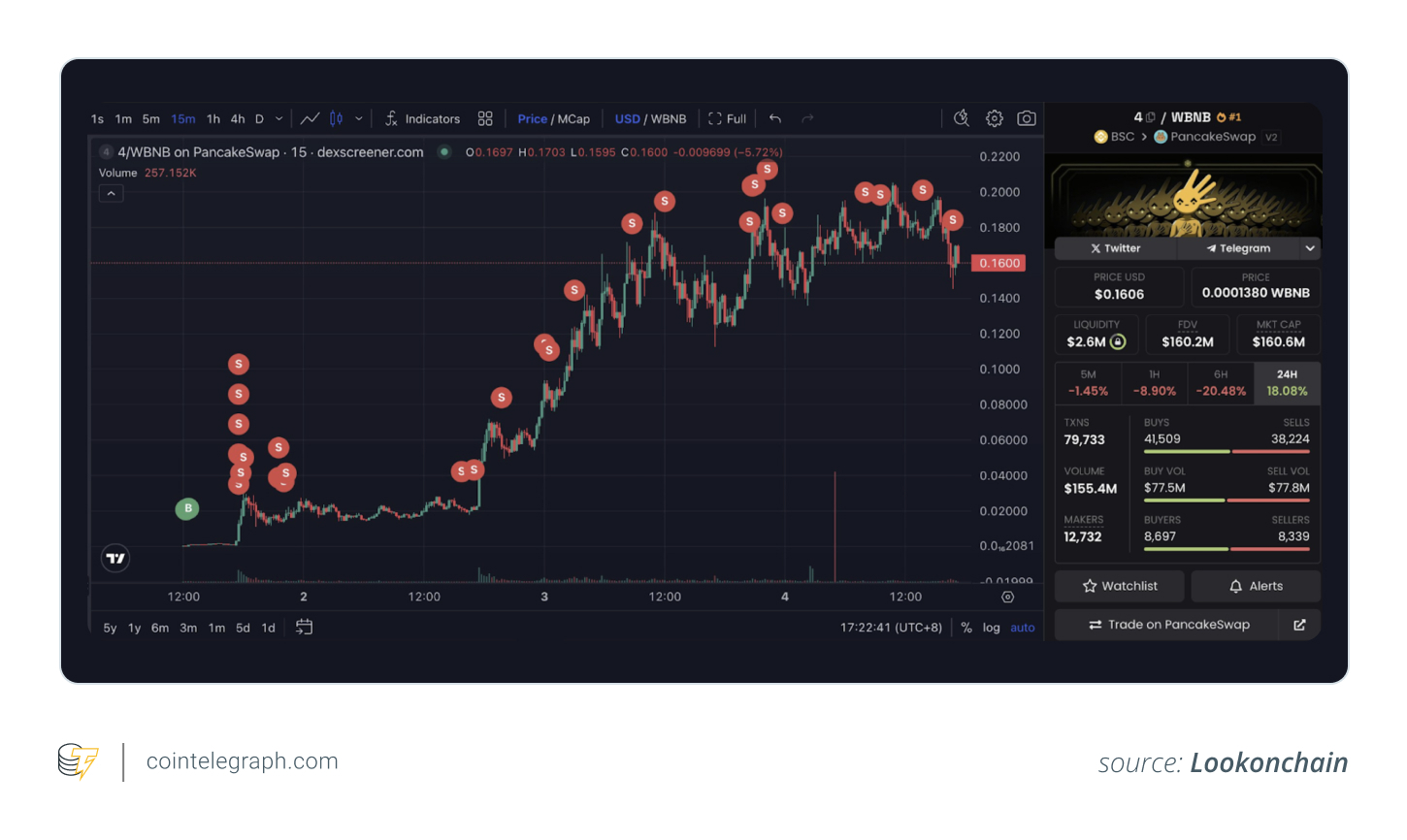 In the rush that followed, one early buyer put about $3,000 worth of BNB (BNB) into “4” and watched it mark up to around $2 million on screen within hours.