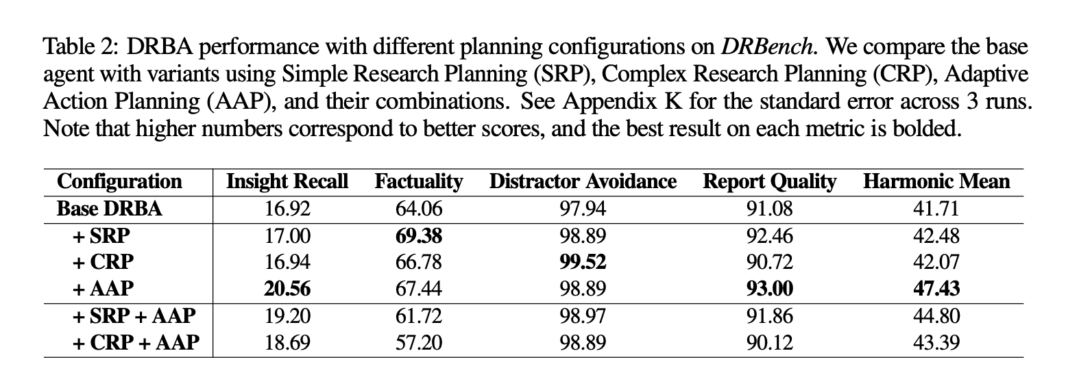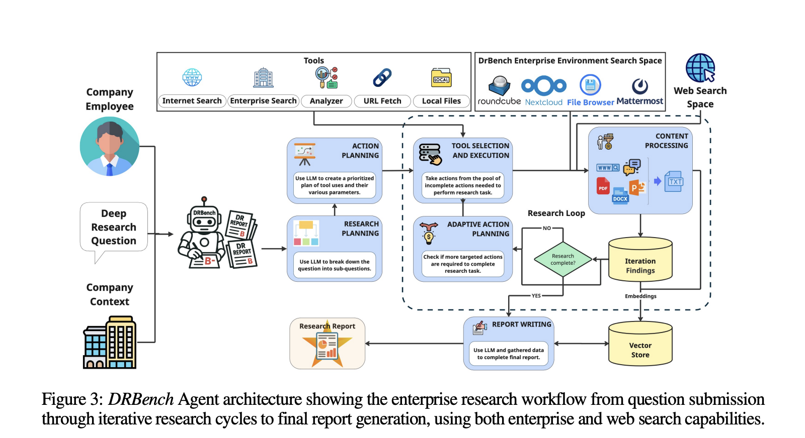 The research team introduces a task-oriented baseline, DRBench Agent (DRBA), designed to operate natively inside the DRBench environment. DRBA is organized into four components: research planning, action planning, a research loop with Adaptive Action Planning (AAP), and report writing. Planning supports two modes: Complex Research Planning (CRP), which specifies investigation areas, expected sources, and success criteria; and Simple Research Planning (SRP), which produces lightweight sub-queries. The research loop iteratively selects tools, processes content (including storage in a vector store), identifies gaps, and continues until completion or a max-iteration budget; the report writer synthesizes findings with citation tracking.