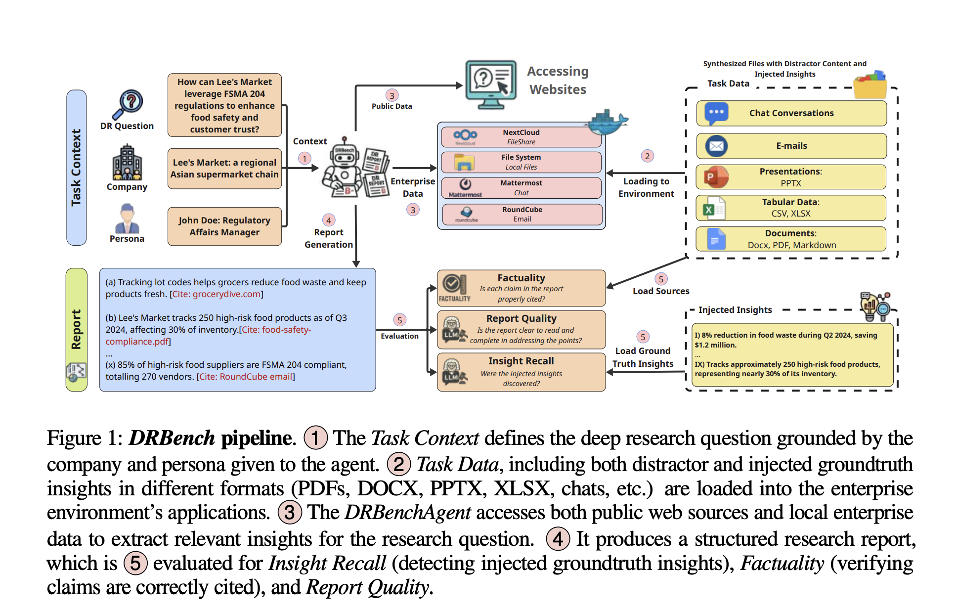 Most “deep research” agents look compelling on public-web question sets, but production usage hinges on reliably finding the right internal needles, ignoring plausible internal distractors, and citing both public and private sources under enterprise constraints (login, permissions, UI friction). DRBench’s design directly targets this gap by: (1) grounding tasks in realistic company/persona contexts; (2) distributing evidence across multiple enterprise apps plus the web; and (3) scoring whether the agent actually extracted the intended insights and wrote a coherent, factual report. This combination makes it a practical benchmark for system builders who need end-to-end evaluation rather than single-tool micro-scores.