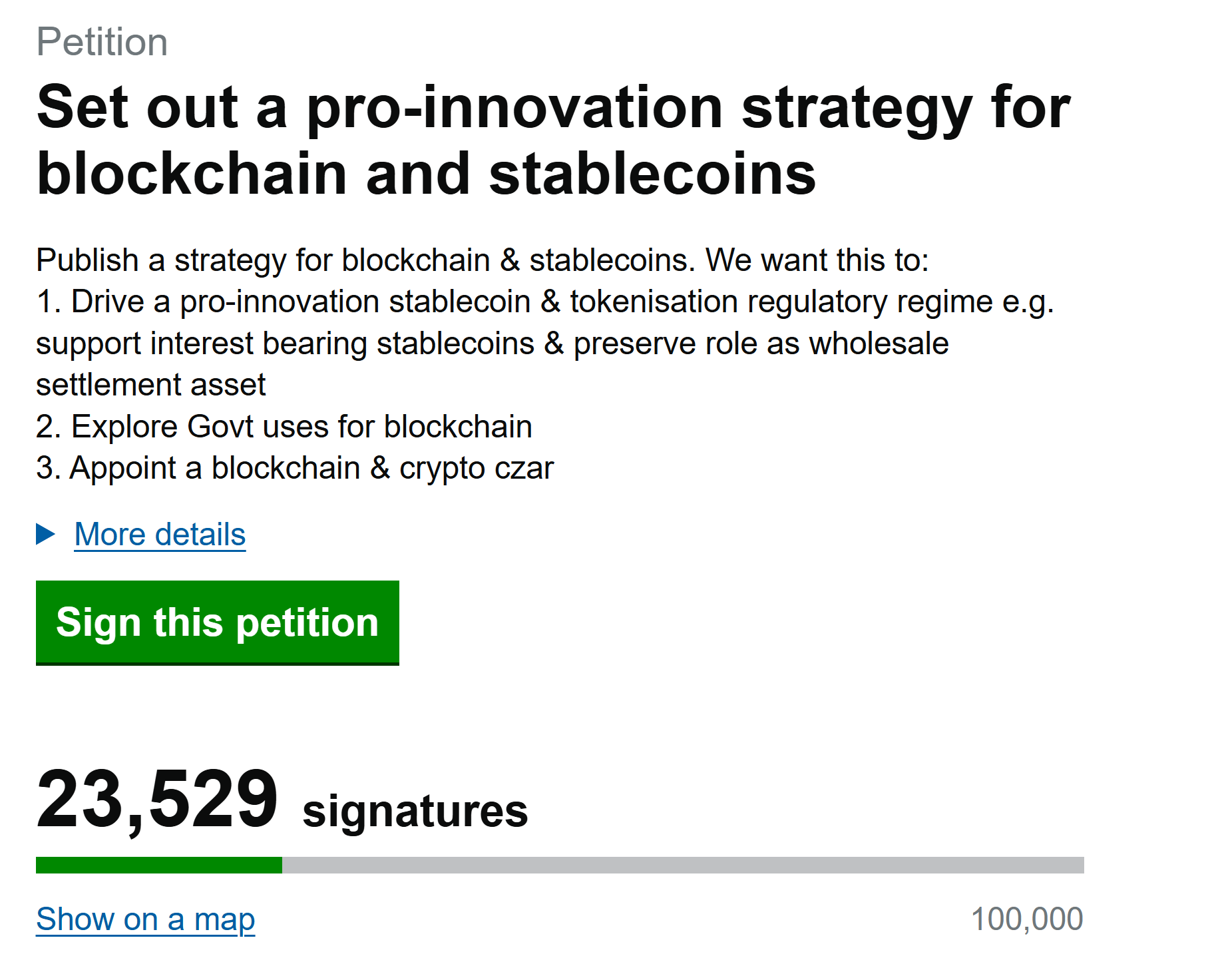 Last month, Coinbase asked users to support a public petition calling on the UK to develop a pro-innovation strategy for blockchain and stablecoins. The petition called for a framework including stablecoin and tokenization regulation, blockchain adoption and the appointment of a blockchain “czar.”