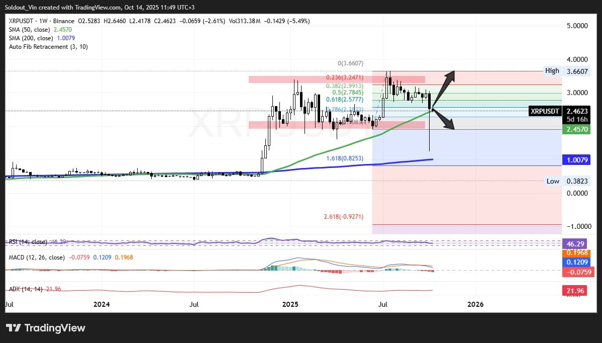 Technically, XRP price action has been very choppy after last week’s sell-off. The weekly chart shows price currently at $2.46, down nearly 17% over the past seven days and sitting under both the 50-week Simple Moving Average (SMA) at $2.46 and the key 0.618 Fibonacci retracement at $2.57, both crucial reference points for long-term traders.