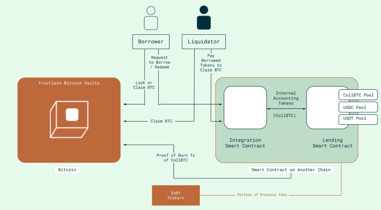 This allows users to lock Bitcoin and bridge it to Ethereum without relying on a federated custodian or bridge. On the Ethereum side, a smart contract verifies the BTC vault via a Bitcoin light client before accounting for collateral.