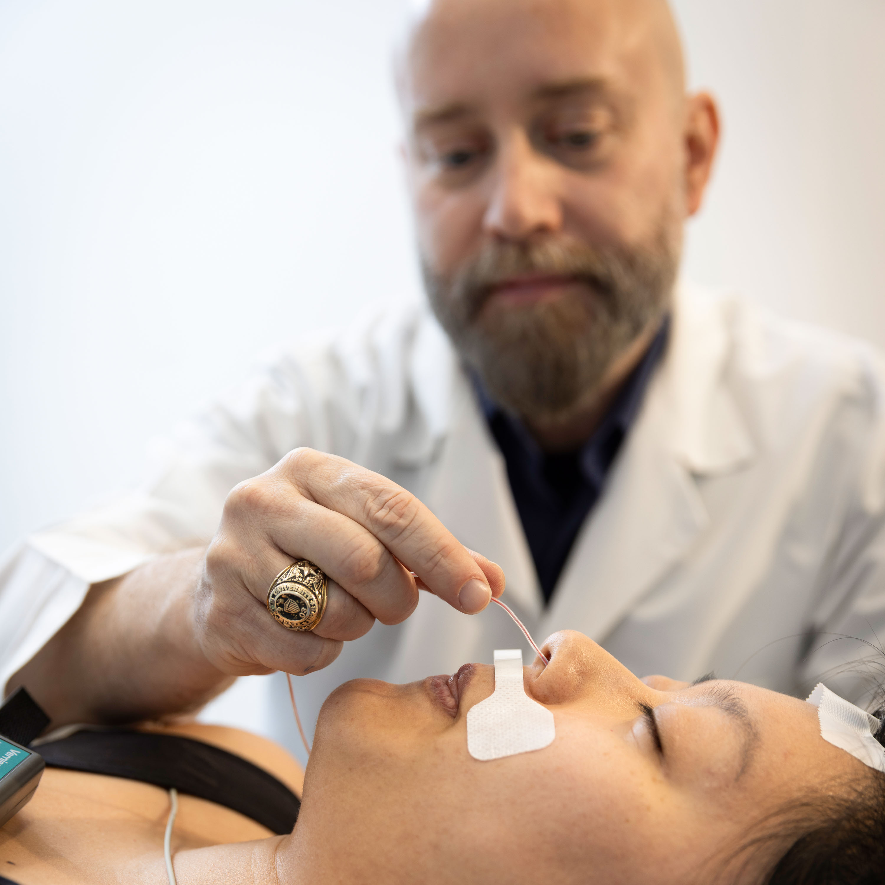 Cowgill and her colleagues Elizabeth Cho (top) and Scott Maddux prepare graduate student Joanna Bui for a “room-temperature test.”