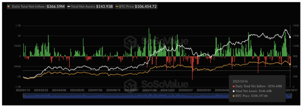 Data from SoSoValue shows that Thursday, October 16, saw a staggering $536.4 million in daily net outflows from Spot Bitcoin ETFs, marking the largest single-day negative flow since August 1, when $812 million exited the market. Out of twelve US Bitcoin ETFs, eight registered major outflows, led by $275.15 million leaving Ark & 21Shares’ ARKB, followed by $132 million from Fidelity’s FBTC. Notably, funds managed by other major companies like Grayscale, BlackRock, Bitwise, VanEck, and Valkyrie also reported significant withdrawals.