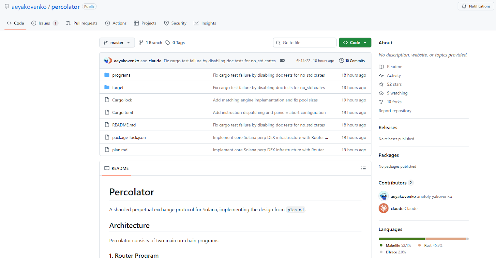 Percolator will consist of two main onchain programs, including the Router program that manager collateral, portfolio margins and cross-slab routing and the Slab program, which is a perpetuals engine run by liquidity provbiders, with “fully self-contained” matching and settlement, according to Yakovenko’s Monday GitHub proposition.