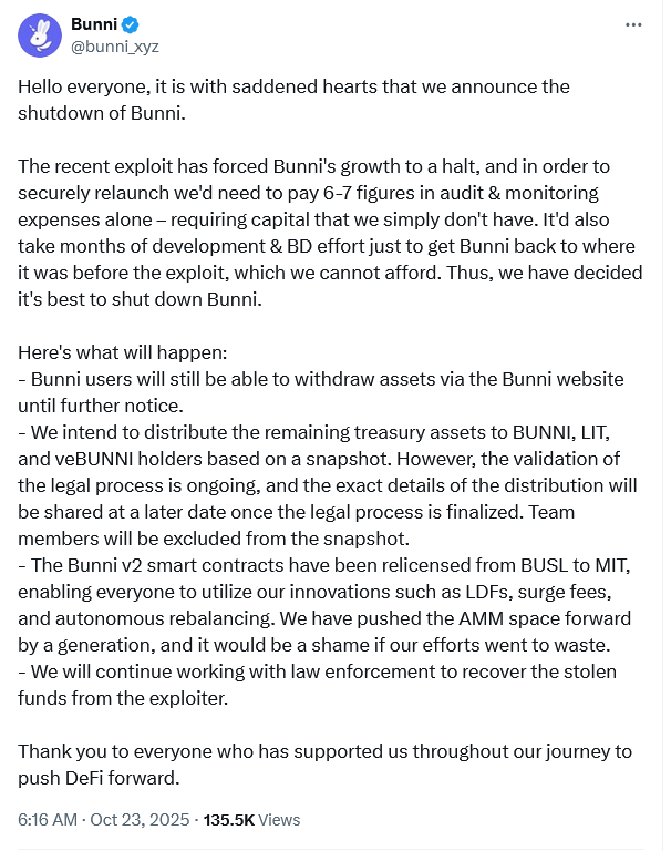 Decentralized exchange Bunni has announced it is shutting down following an $8.4 million exploit in September, and is now the second crypto project team to throw in the towel this week.