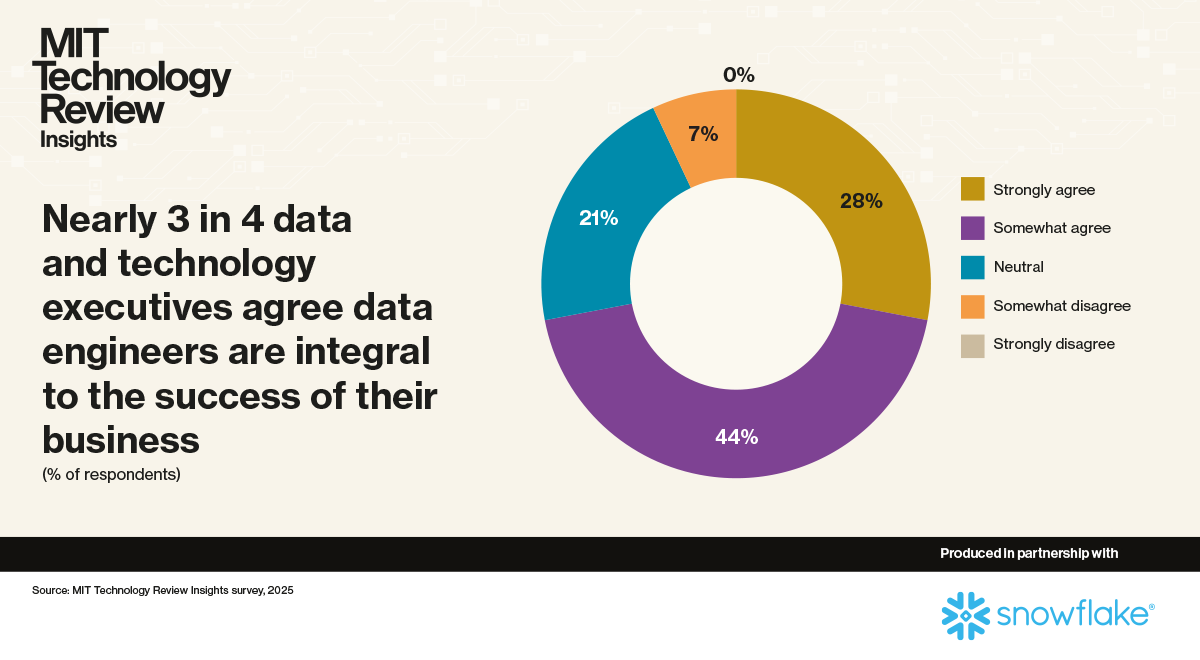 - Data engineers are integral to the business. This is the view of 72% of the surveyed technology leaders—and 86% of those in the survey’s biggest organizations, where AI maturity is greatest. It is a view held especially strongly among executives in financial services and manufacturing companies.