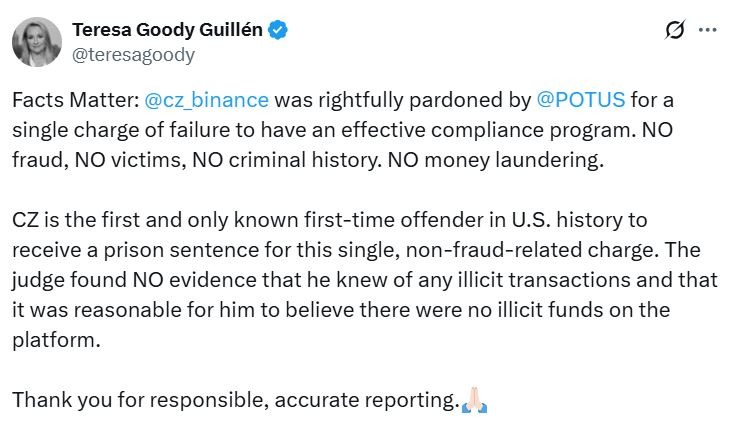 CZ’s crypto attorney Teresa Goody Guillén on Thursday said the pardon was the right call because her client had “a single charge of failure to have an effective compliance program. NO fraud, NO victims, NO criminal history. NO money laundering.”