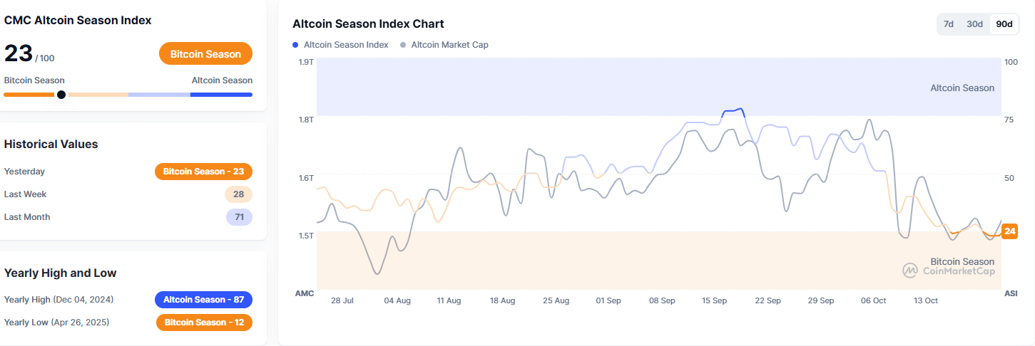 CoinMarketCap’s altcoin season indicator currently stands at 23, which still signals “Bitcoin season” until the gauge surpasses the 75 level.