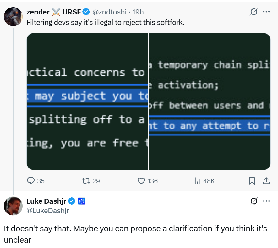 Dashjr also appeared to support this argument in the comments of a user who claimed it’s illegal to reject the softork, posting that it “doesn’t say that. Maybe you can propose a clarification if you think it’s unclear.”