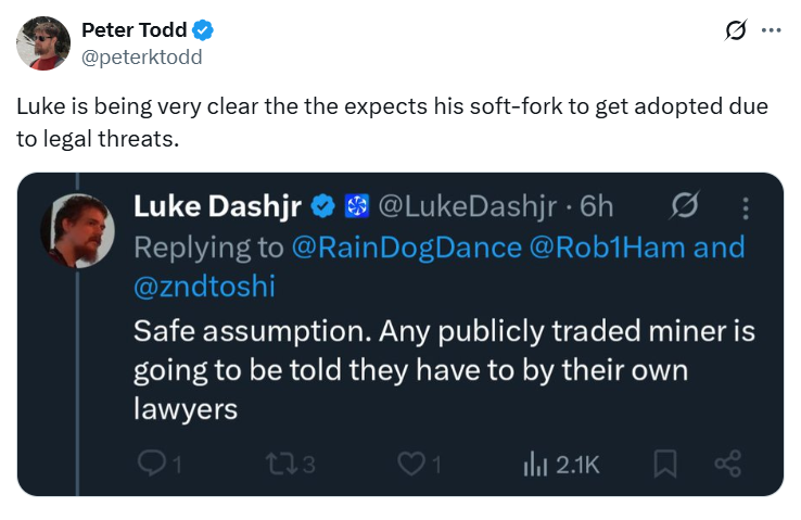 Canadian cryptographer and computer scientist Peter Todd also weighed in with a screenshot of Dashjr, saying it’s “clear he expects his soft-fork to get adopted due to legal threats.”