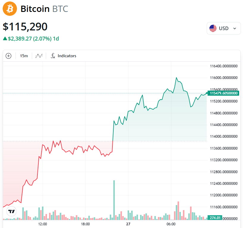 Bitcoin (BTC) briefly recovered above a two-week high of $116,400 on Monday, driven by investor expectations of two significant macroeconomic catalysts this week: the incoming Federal Open Market Committee’s (FOMC) interest rate decision on Wednesday and a potential trade deal between the US and China, which could come as soon as Thursday.