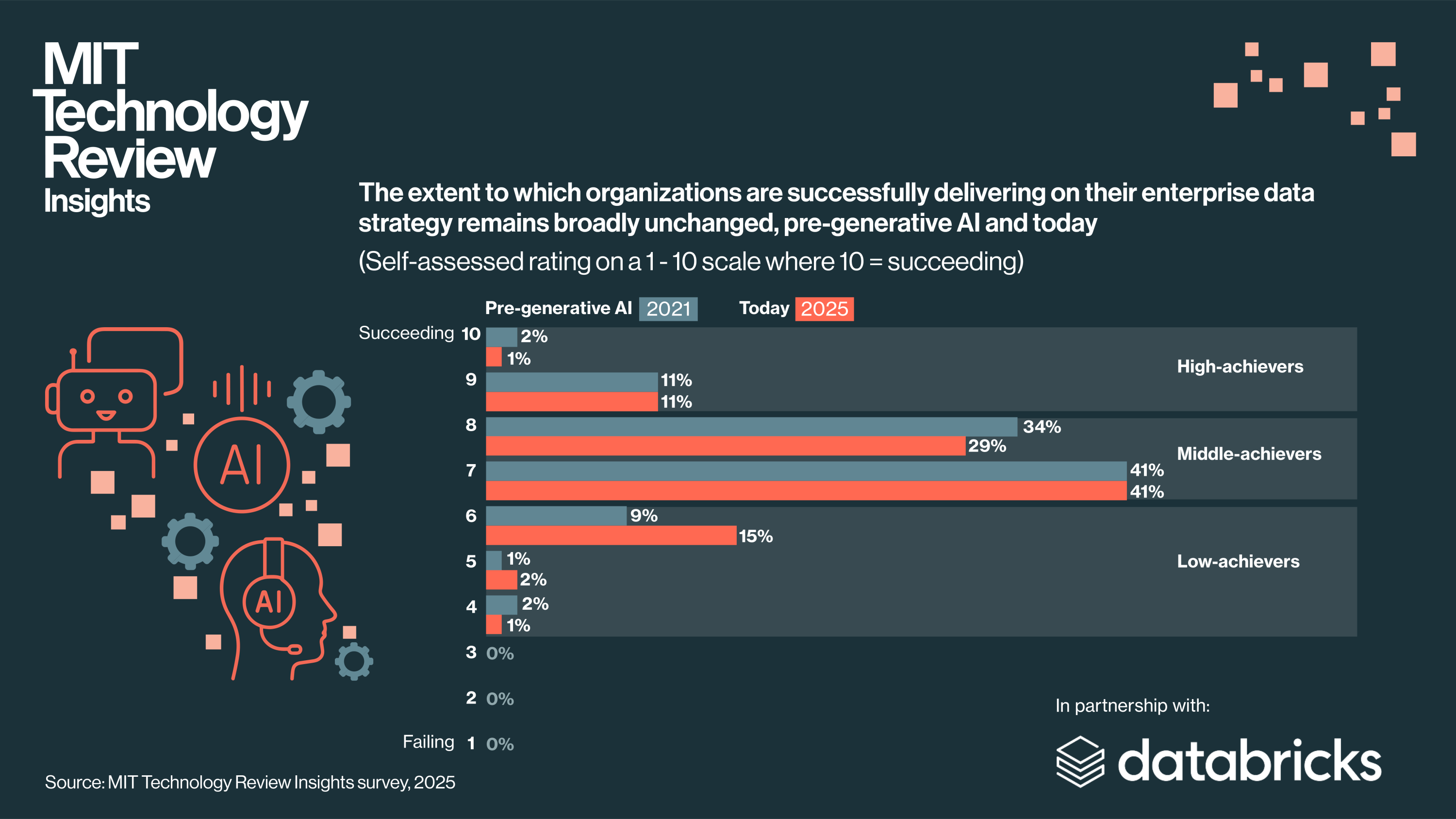 • Few data teams are keeping pace with AI. Organizations are doing no better today at delivering on data strategy than in pre-generative AI days. Among those surveyed in 2025, 12% are self-assessed data “high achievers” compared with 13% in 2021. Shortages of skilled talent remain a constraint, but teams also struggle with accessing fresh data, tracing lineage, and dealing with security complexity—important requirements for AI success.