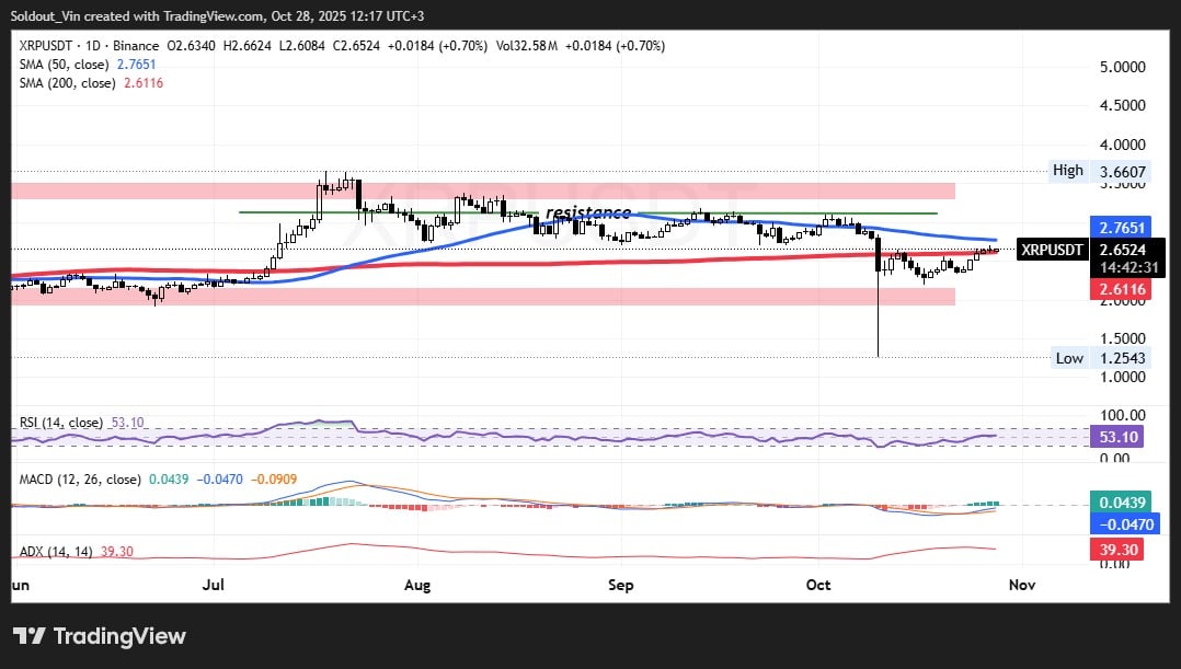 The nearest resistance sits at $2.77 (the 50-day SMA). If XRP can surge past this level, the price may target the next resistance near $3.00. A key psychological and technical zone where sellers have appeared before.