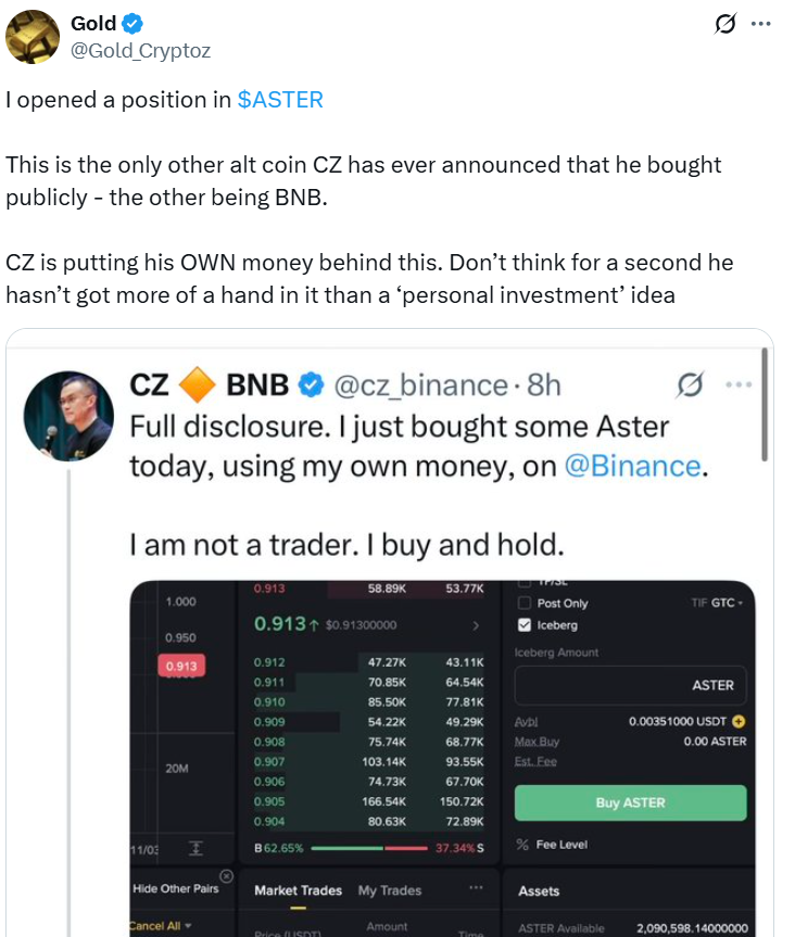 A trader under the handle “Gold” announced on X that they had opened a position in Aster after CZ’s post, explaining it was the first time CZ had ever announced buying a token outside of BNB.