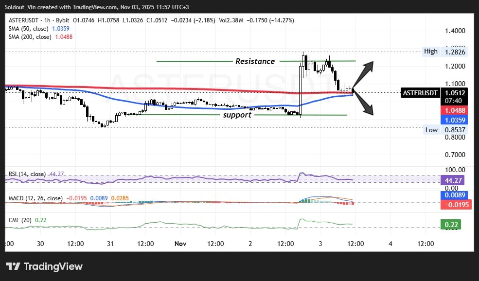 Looking at the ASTERUSDT price chart, the coin price sits near $1.05 after the massive bounce. Resistance is now marked at $1.25, which was the recent high. Support is found at $1.05, and the next lower zone is near $0.85.