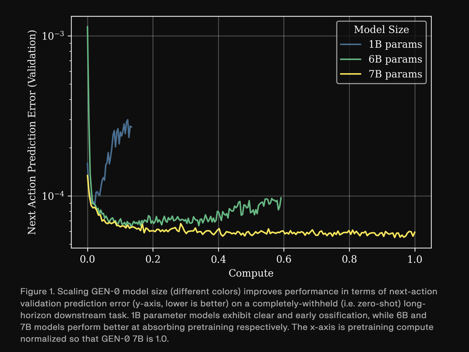 The above image plots next action validation prediction error on a completely withheld long horizon downstream task across model sizes and pre-training compute. 1B models plateau early while 6B and 7B models continue to improve as pretraining increases. The research team connect this phase transition to Moravec’s Paradox, arguing that physical commonsense and dexterity appear to require higher compute thresholds than abstract language reasoning, and that GEN-θ is operating beyond that activation point.
