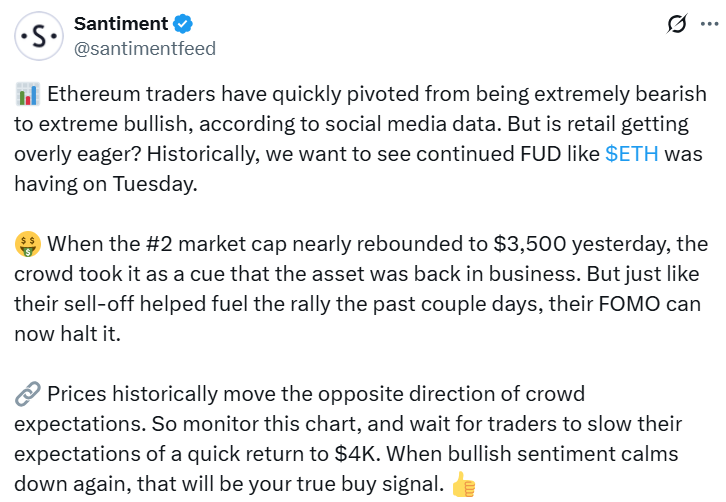 “Ethereum traders have quickly pivoted from being extremely bearish to extreme bullish,” Santiment said, adding that when ETH “nearly rebounded to $3,500 yesterday, the crowd took it as a cue that the asset was back in business.”