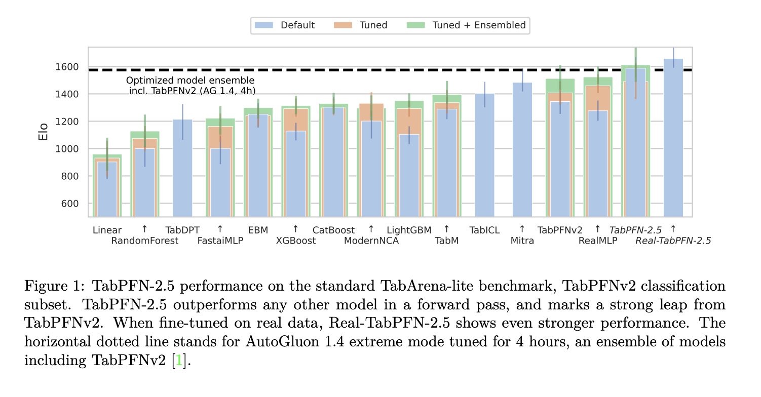 The research team uses the TabArena Lite benchmark to measure medium sized tasks up to 10,000 samples and 500 features. TabPFN-2.5 in a forward pass outperforms any other model in the comparison. When the Real-TabPFN-2.5 variant is fine tuned on real datasets, the lead increases further. AutoGluon 1.4 in extreme mode is the baseline ensemble, tuned for 4 hours and even including TabPFNv2.