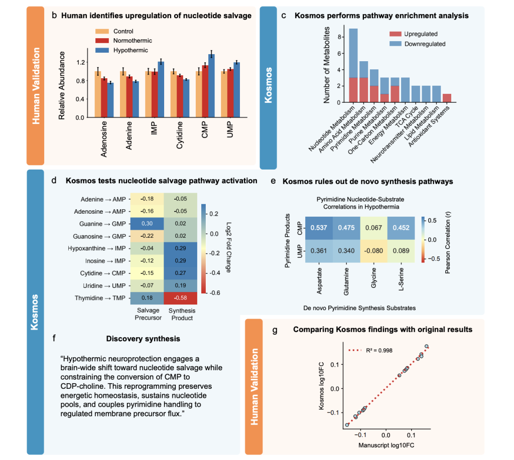 In the first discovery, Kosmos analyzes metabolomics data from a mouse hypothermia experiment. It identifies nucleotide metabolism as the dominant altered pathway in hypothermic brains, with decreased precursor bases and nucleosides and increased monophosphate products. The system concludes that nucleotide salvage pathways dominate over de novo synthesis during protective hypothermia, which matches an independent human analysis that was unpublished at the time of the run.