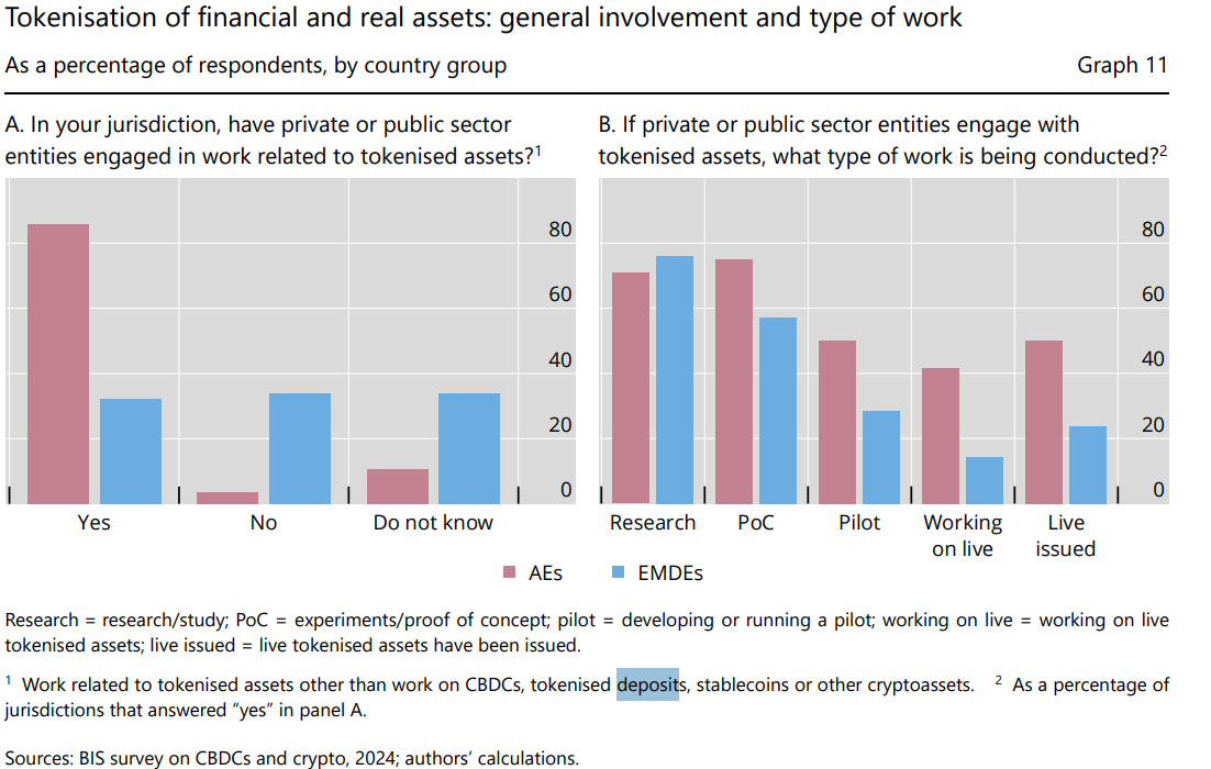 At least one-third of surveyed commercial banks have launched, piloted, or researched tokenized deposits, according to a 2024 survey by the Bank for International Settlements (BIS).