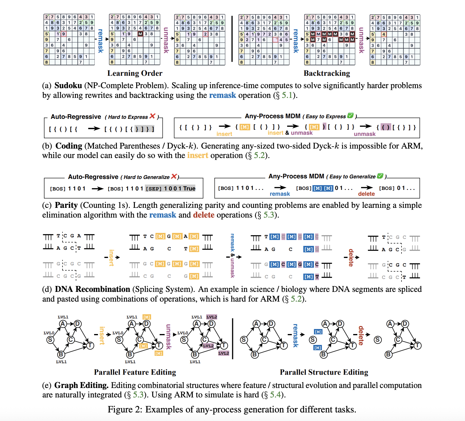 Any-Process MDM is an important step because it treats generation as a full algorithm, not just a decoding order. The research work shows that Masked Diffusion Models already match PRAM parallel time, but remain in P under polynomial context, similar to autoregressive models. By adding remask, insert and delete, AP-MDM reaches PSPACE-level expressivity with polynomial context and achieves strong empirical gains on Sudoku, Dyck, graph editing and parity. Overall, AP-MDM makes a strong case that future frontier LLMs should adopt edit-based Any-Process Generation, not just faster autoregression.