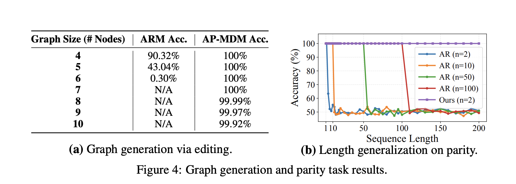 For graph editing tasks under global constraints, AP-MDM uses insert, delete and remask to implement a sequence of structured edits over a graph representation. The reported accuracy stays near perfect as graph size scales, while ARM degrades as the graph gets larger.