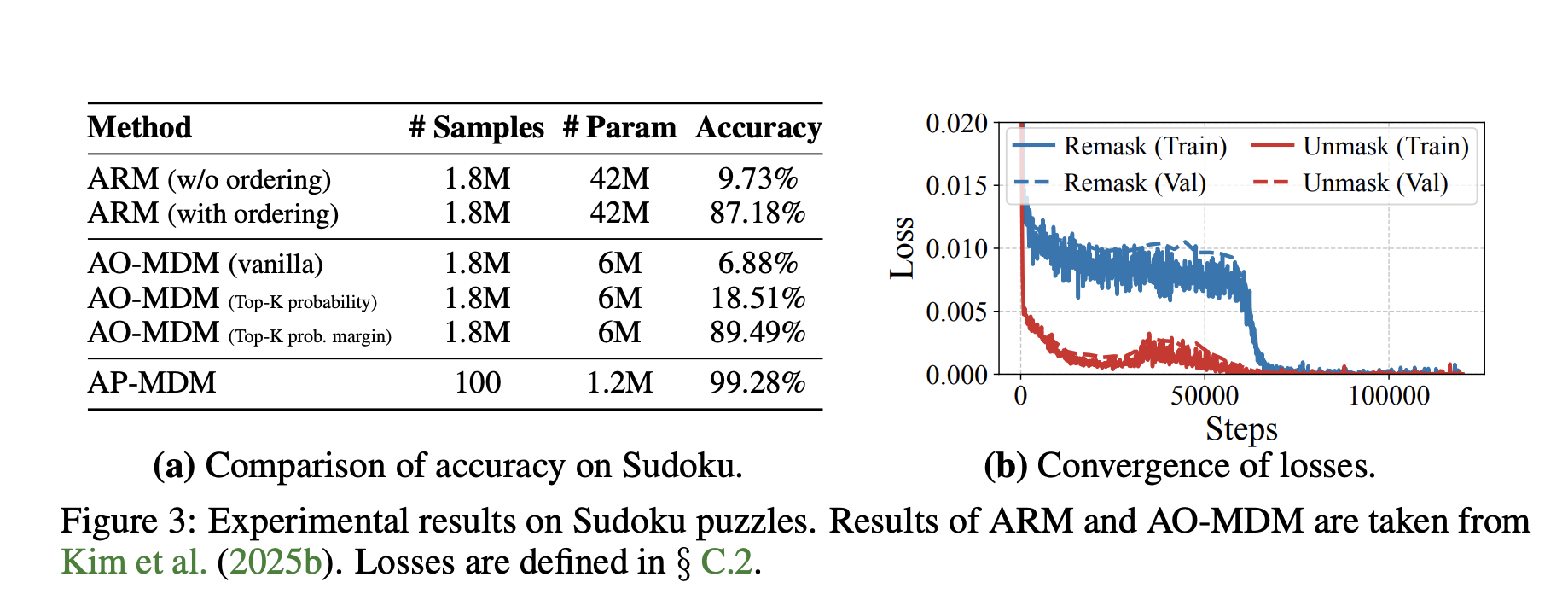 - On hard reasoning tasks such as generalized Sudoku, Dyck languages, graph editing and parity, AP MDM shows strong empirical advantages, for example achieving about 99.28 percent Sudoku accuracy with only 100 training instances and a much smaller parameter budget than autoregressive and any order MDM baselines.