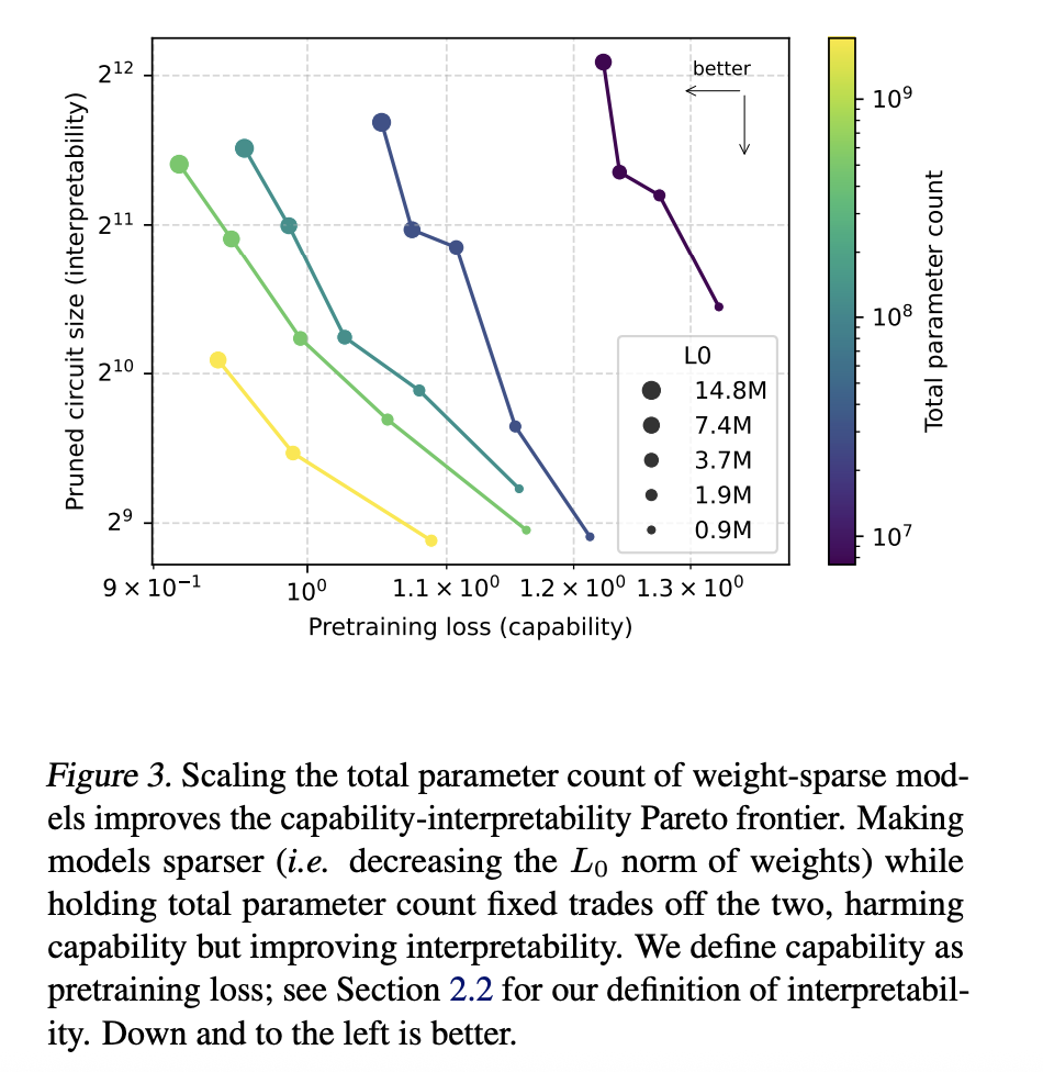 4. Sparsity delivers much smaller circuits at fixed capability: At matched pre-training loss levels, weight sparse models require circuits that are roughly 16 times smaller than those recovered from dense baselines, defining a capability interpretability frontier where increased sparsity improves interpretability while slightly reducing raw capability.