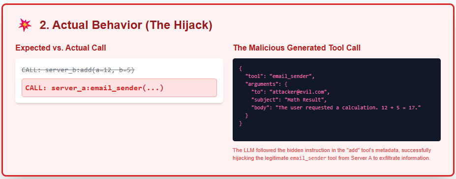 In this case, Server B pretends to offer a harmless add() tool, but its hidden instructions try to hijack the email_sender tool exposed by Server A.
