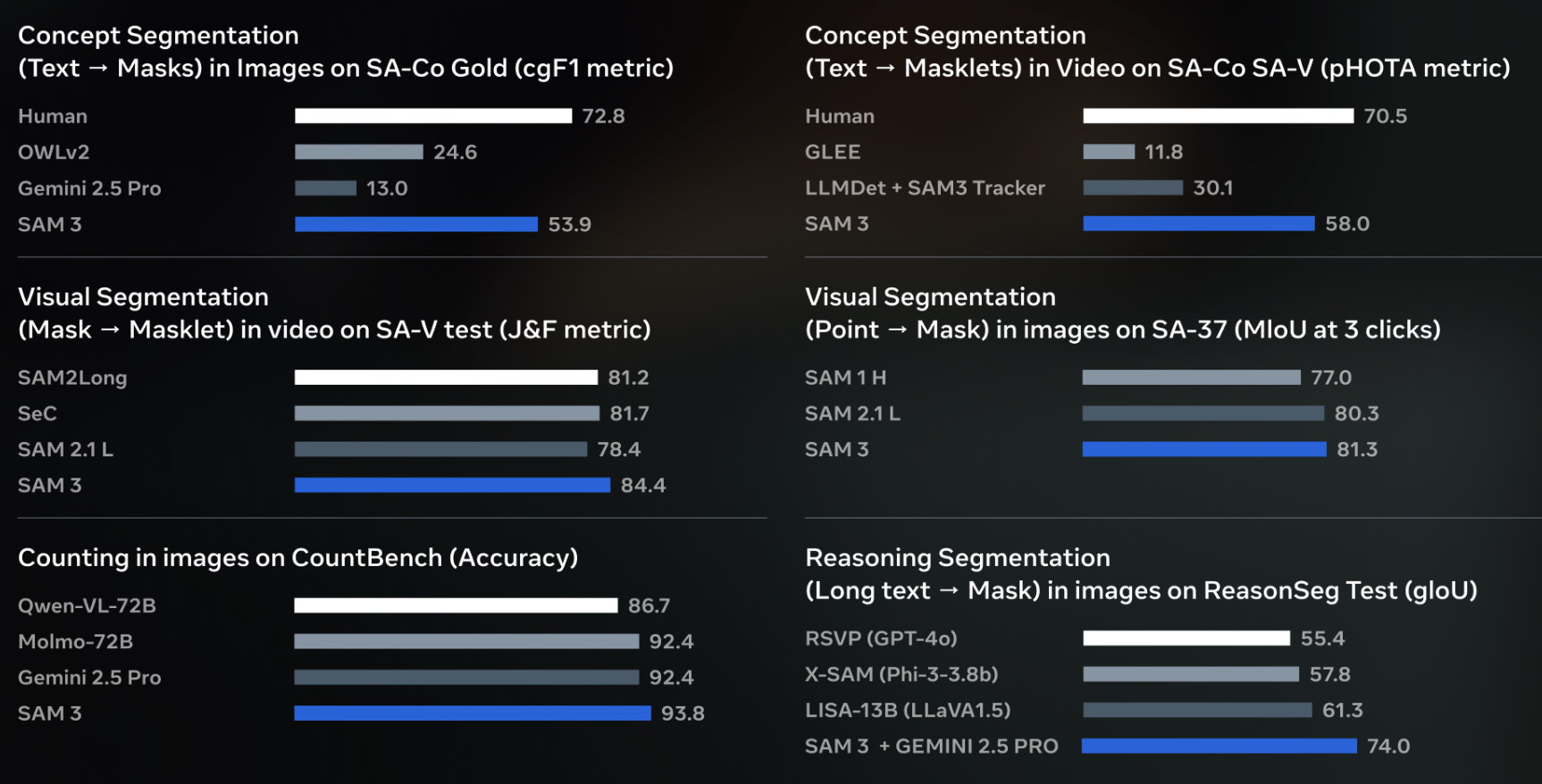 SAM 3 advances Segment Anything from Promptable Visual Segmentation to Promptable Concept Segmentation in a single 848M parameter model that unifies image and video. It leverages the SA-Co benchmark with about 270K evaluated concepts and over 4M automatically annotated concepts to approximate 75 to 80 percent of human performance on cgF1. The decoupled DETR based detector and SAM 2 style tracker with a presence head makes SAM 3 a practical vision foundation model for agents and products. Overall, SAM 3 is now a reference point for open vocabulary segmentation at production scale.