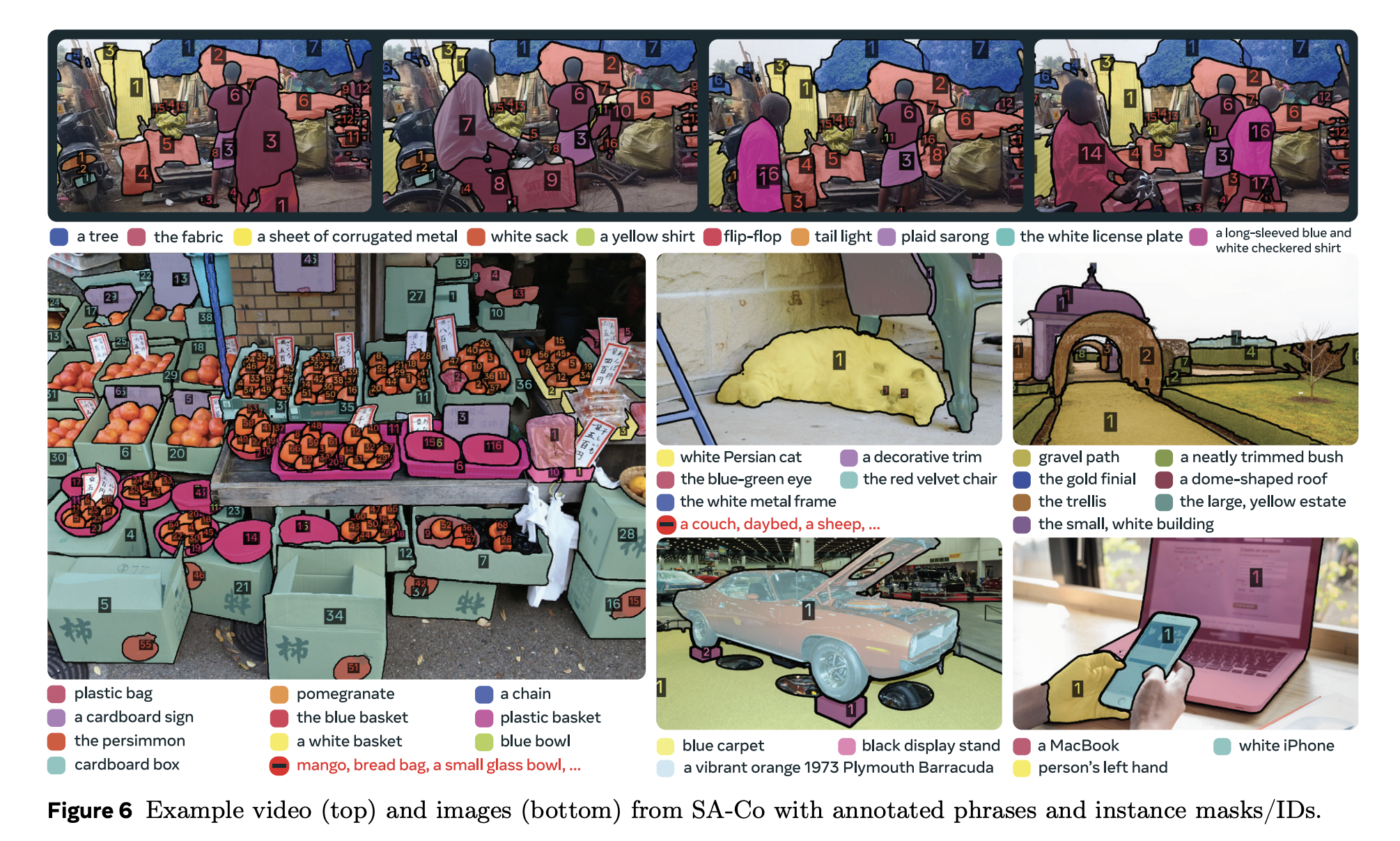 To train and evaluate Promptable Concept Segmentation (PCS), Meta introduces the SA-Co family of datasets and benchmarks. The SA-Co benchmark contains 270K unique concepts, which is more than 50 times the number of concepts in previous open vocabulary segmentation benchmarks. Every image or video is paired with noun phrases and dense instance masks for all objects that match each phrase, including negative prompts where no objects should match.